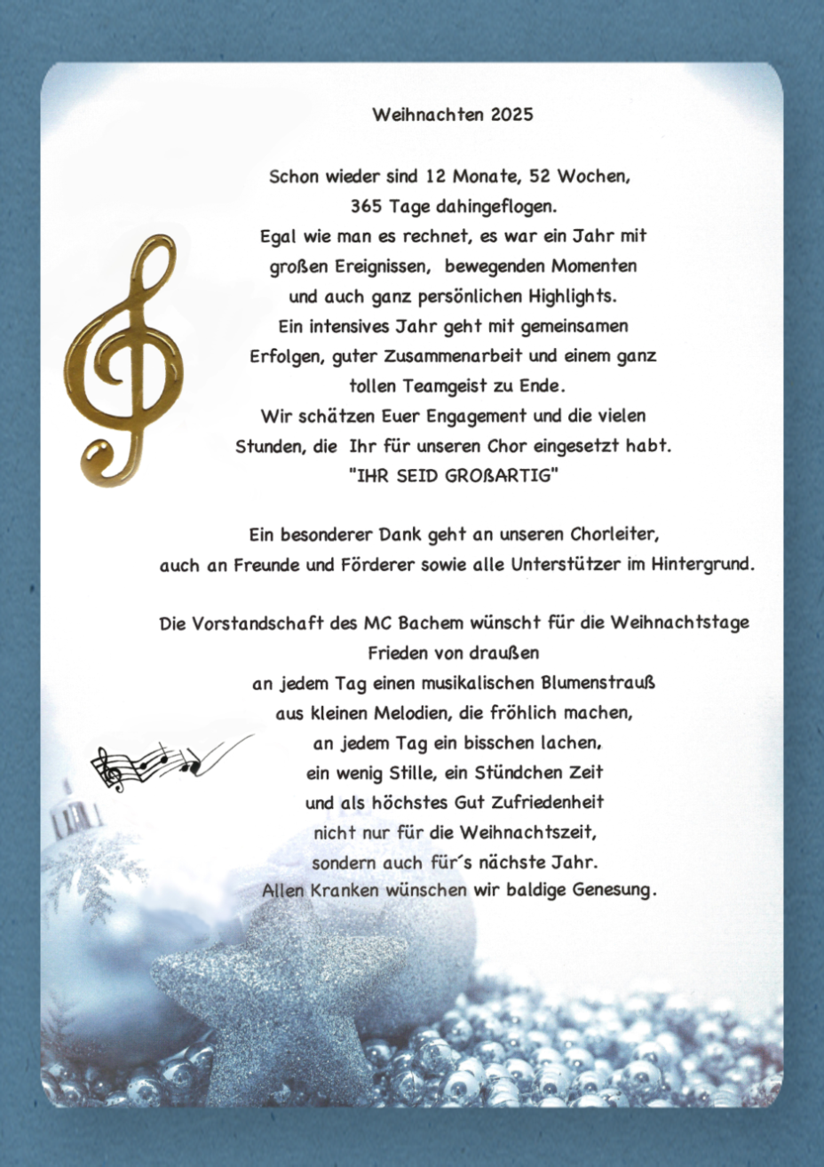 Der Männerchor Bachem pflegt, von weltlichen bis zu sakralen, modernen und internationalen Chorwerken, das deutsche Liedgut bei seinen Konzerten und Auftritten.